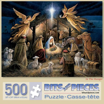 Experience the quiet majesty of Christmas night with Ruane Manning’s In the Manger puzzle. Under a brilliant guiding star, the nativity unfolds with stunning detail: Mary cradles the baby Jesus in a humble stable, surrounded by Joseph, gentle animals, and worshipful shepherds. The three wise men kneel with their gifts, while angels float above, their golden robes aglow as they herald the Savior’s birth. Every element radiates peace and reverence, inviting you to reflect on this timeless moment of hope and grace.