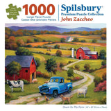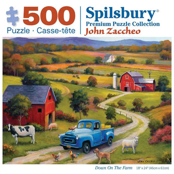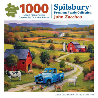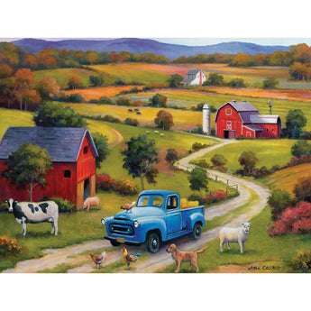 Take a peaceful stroll through the countryside with Down on the Farm by John Zaccheo. This vibrant puzzle showcases a classic rural landscape, complete with a vintage blue pickup truck, friendly farm animals, and lush pastures. Red barns and silos dot the rolling hills, while colorful trees and golden fields stretch into the distance under a soft blue sky. A perfect depiction of the simple joys of farm life, this scene radiates tranquility and warmth.