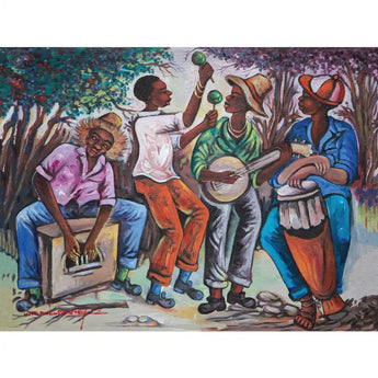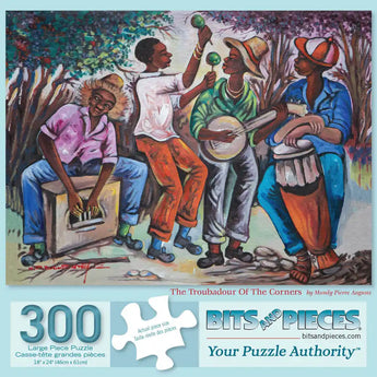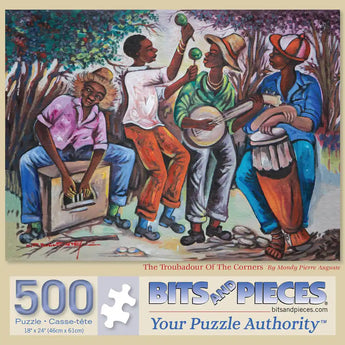 Feel the rhythm and energy of The Troubadour of the Corners, a captivating puzzle by Mondy Pierre Auguste. This lively scene captures the joy of music as a group of talented street musicians plays maracas, drums, and stringed instruments in perfect harmony. The bold brushstrokes and vibrant colors bring this dynamic performance to life, making it a fun and engaging puzzle to piece together. Let the music guide you as you assemble this beautiful cultural celebration!
