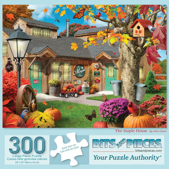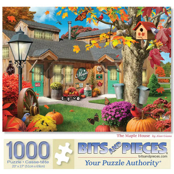 The Maple House jigsaw puzzle is designed by Alan Giana. Puzzles are renowned for their engaging complexity, offering a satisfying challenge with their smaller, intricate pieces. Capture the rustic charm of autumn in this picturesque puzzle, featuring a delightful medley of fall delights like vibrant orange leaves, plump pumpkins, blooming mums, a busy squirrel feasting, graceful butterflies, and a cardinal perched on a pumpkin, all beautifully encapsulating the essence of this colorful season. Available in multiple piece counts.
