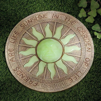 The Glow-In-The-Dark Sun Stepping Stone is a unique and functional decoration for your yard or garden. Sunlight charges the phosphorescence of the light green segment of sun art during the day; these pieces will glow in the dark once the sun sets. The inscription on the stepping stone says, "Friends are Like Sunshine in the Garden of Life."