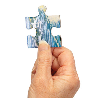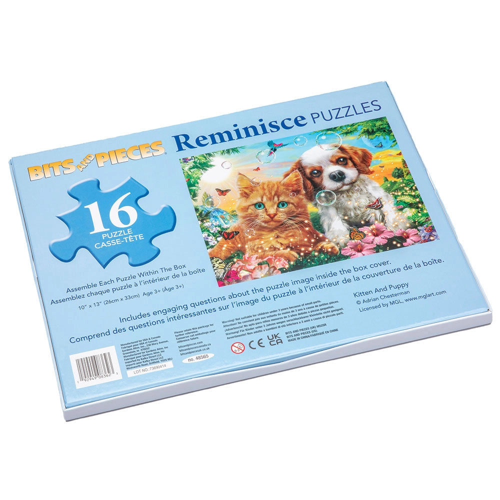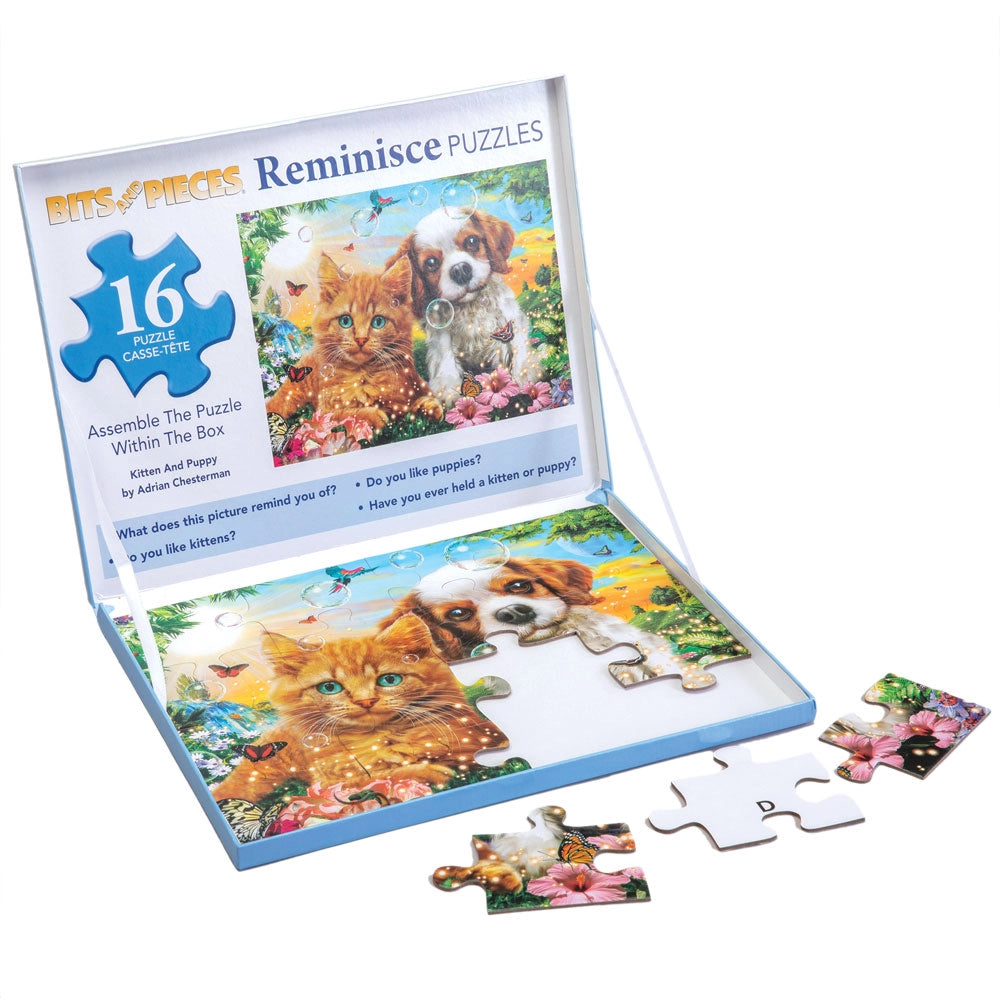Bring home the charm of furry friendship with the Kitten and Puppy Reminisce Puzzle by Adrian Chesterman! This delightful puzzle features an adorable kitten and puppy surrounded by colorful butterflies and glowing bubbles, making it a joy to assemble. Designed with extra-large pieces for easy handling, it's perfect for kids, seniors, and puzzle lovers of all ages. Available in 16 or 35 pieces, it includes a slim box tray, a reference image, and fun questions for an interactive experience. Stay connected with family and friends with our Reminisce Puzzles collection. Not only are puzzles good for young, developing brains, but they can also benefit older individuals with memory loss. Each Reminisce Puzzle comes in an easy open slim box tray for puzzle assembly. You’ll find a reference image along with four engaging questions printed inside the box and an insert with tips for a pleasant puzzle experience. Each puzzle is available in 16 and 35 extra large pieces and measures 10" x 13". Includes letter codes on back to sort pieces by section. This jigsaw puzzle is designed by Adrian Chesterman.