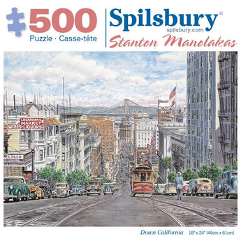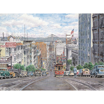 Take a step back in time with Stanton Manolakas’ Down California puzzle, capturing the charm and history of San Francisco’s iconic streets. This beautifully detailed scene showcases the city’s famous cable cars making their way down a steep incline, framed by classic architecture, vintage automobiles, and bustling storefronts. In the distance, the Bay Bridge rises above the skyline, adding depth and grandeur to the nostalgic urban landscape.