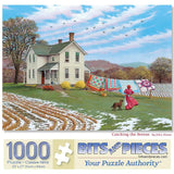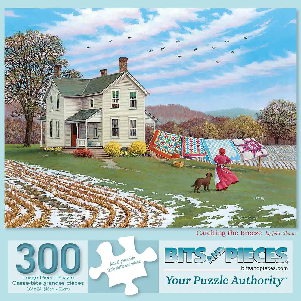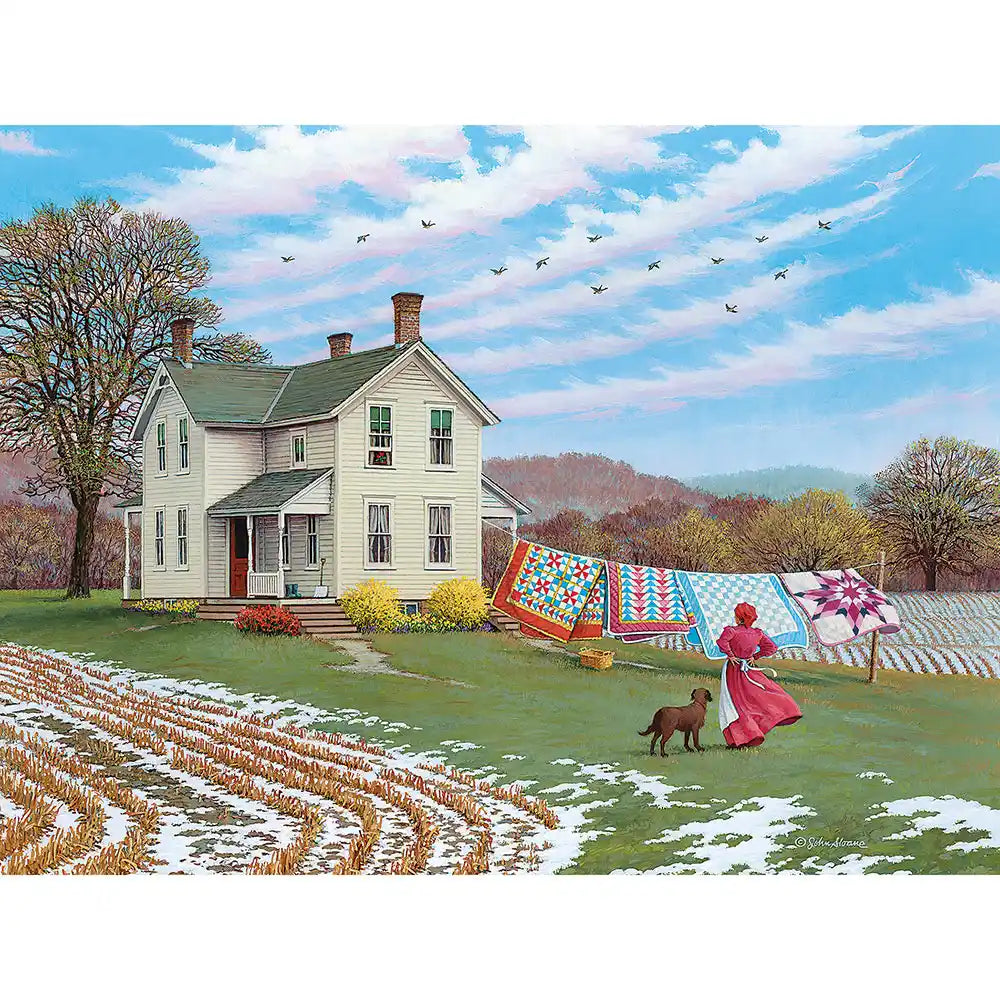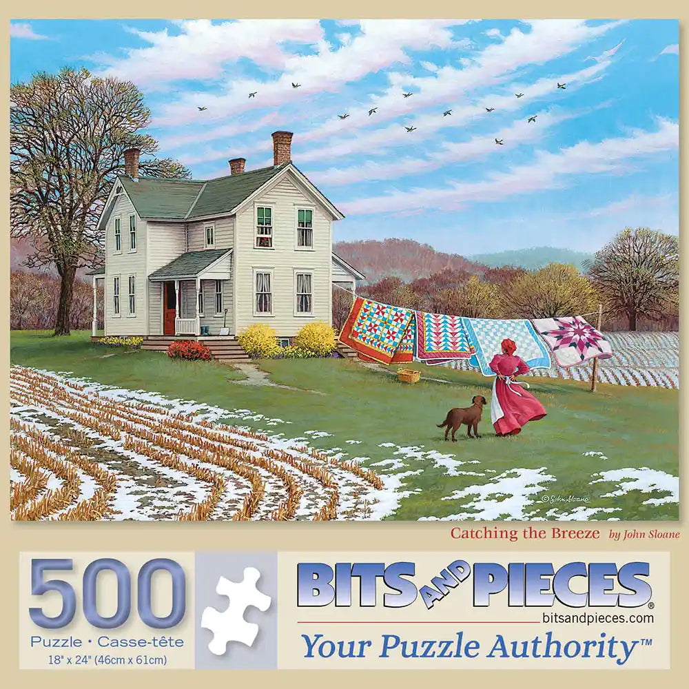 Step into a serene country scene with "Catching the Breeze," a beautifully designed jigsaw puzzle by the talented John Sloane. This captivating image transports you to a simpler time, showcasing a charming farmhouse surrounded by rolling fields, where a gentle breeze carries the scent of fresh air. The centerpiece of the artwork is a colorful display of handmade quilts hanging to dry, each one telling a story of craftsmanship and care. A woman in a classic red dress tends to the task, accompanied by her loyal dog, as birds soar gracefully across the sky