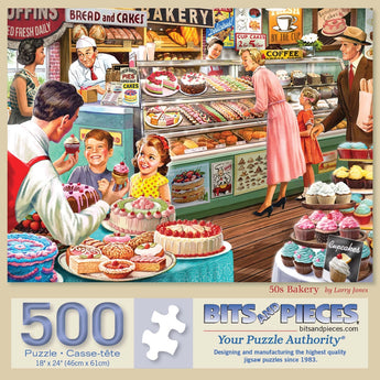 Indulge in the warmth and nostalgia of a classic bakery with the "50's Bakery" jigsaw puzzle, designed by artist Larry Jones and available in 300 and 500-piece counts. This delightful puzzle features a cozy and inviting scene that celebrates the joy of baking.