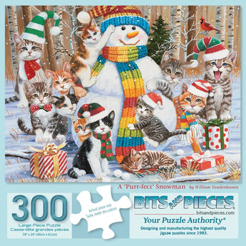 Get ready for some feline holiday fun with A Purr-fect Snowman by William Vanderdasson. This playful puzzle features a cheerful snowman surrounded by an adorable group of kittens dressed in their festive best. With scarves, hats, and Christmas gifts, these mischievous cats will bring a smile to your face as you piece together this heartwarming winter scene.
