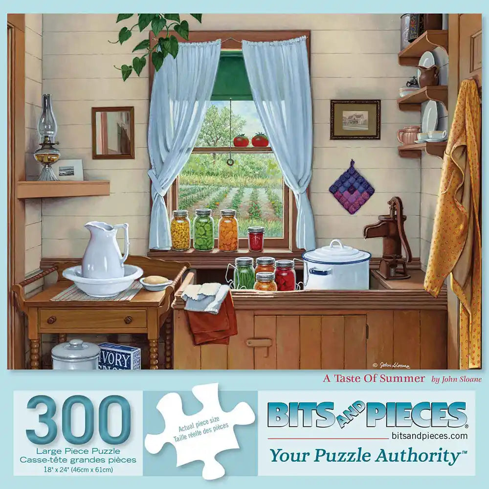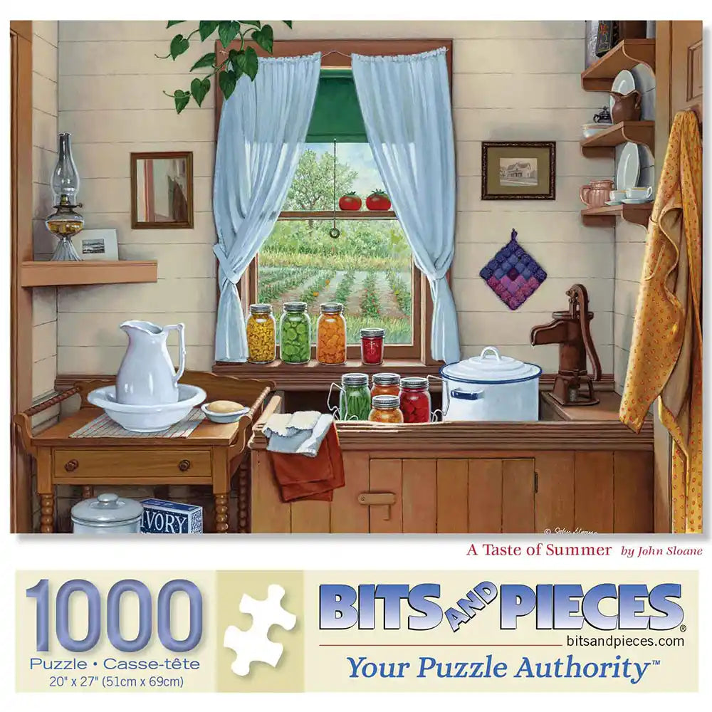 Relive the charm of simpler times with this delightful puzzle, "A Taste of Summer," designed by John Sloane. The artwork features a cozy farmhouse kitchen filled with jars of freshly preserved produce, capturing the essence of a bountiful harvest. Beyond the open window, a vibrant garden stretches into the distance, blending nostalgia with a touch of seasonal warmth. Perfect for creating a peaceful and satisfying experience, this puzzle makes a thoughtful gift or addition to your collection. Celebrate the timeless beauty of summer with this heartwarming design.