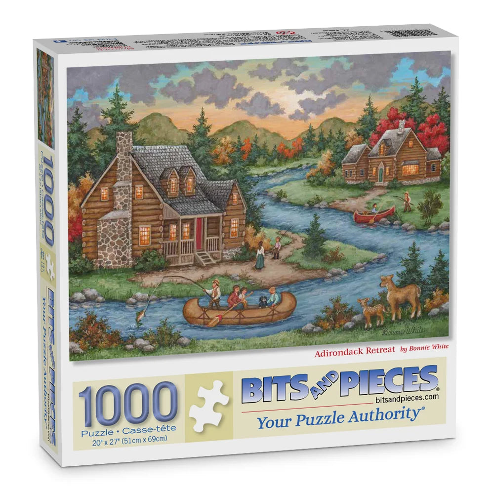 Bonnie White’s Adirondack Retreat captures a serene mountain escape where log cabins line a sparkling river, canoers glide past, and wildlife roams under golden autumn skies. This picturesque fall puzzle is perfect for nature lovers, outdoor adventurers, and anyone who enjoys the peaceful beauty of the Adirondacks.