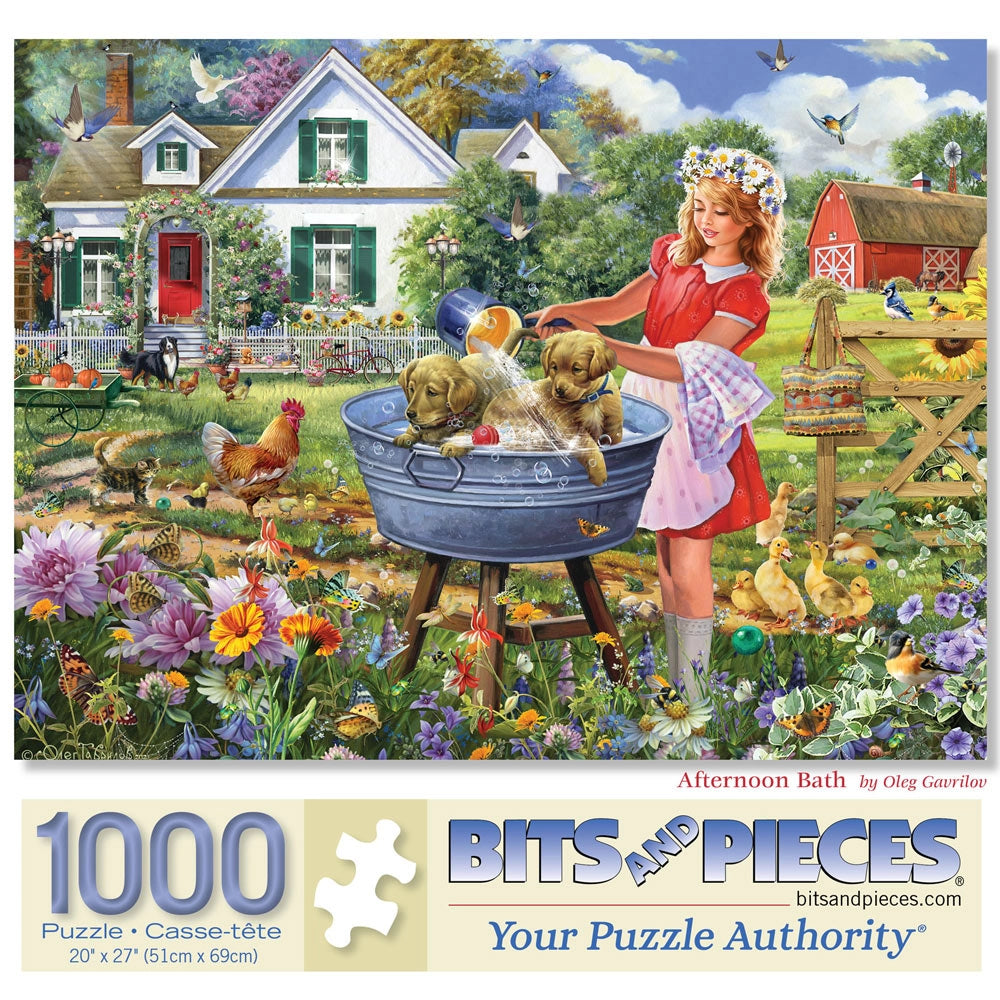 Oleg Gavrilov opens up a whimsical world with his Afternoon Bath Jigsaw Puzzle. This charming puzzle captures a playful scene of puppies enjoying a bath in a vibrant countryside garden. Puzzle enthusiasts and animal lovers of all ages will enjoy this heart warming puzzle.