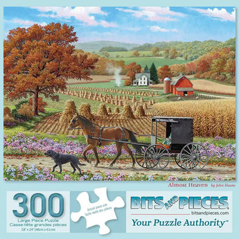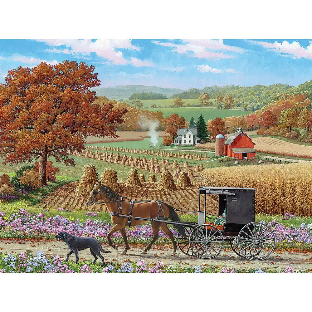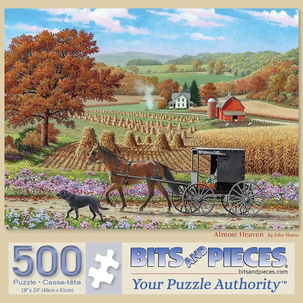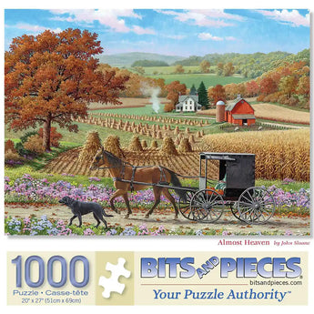Experience the tranquility of rural life with the "Almost Heaven" puzzle designed by John Sloane. This idyllic scene showcases a picturesque farmstead, golden cornfields, and a horse-drawn buggy traveling along a peaceful country road. The autumn foliage and blooming wildflowers bring vibrant colors to this serene setting, evoking the charm of a simpler time. Perfect for creating a relaxing and immersive puzzle experience or gifting to a lover of pastoral art. Celebrate the beauty of the countryside with this heartwarming design.