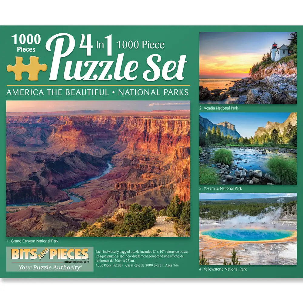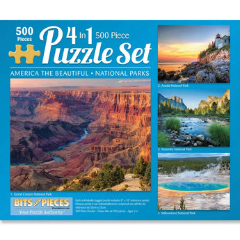Explore the natural wonders of the United States with the America the Beautiful 4-in-1 Multi-Pack Puzzle Set. This stunning collection features breathtaking scenes from four iconic national parks: the majestic Grand Canyon, the serene coastline of Acadia, the vibrant geothermal pools of Yellowstone, and the towering granite peaks of Yosemite. Each puzzle captures the awe-inspiring beauty and diversity of America’s landscapes, offering hours of fun and adventure for puzzle enthusiasts.