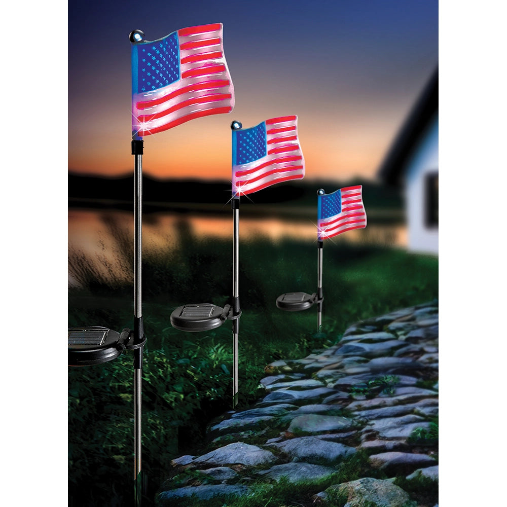 Celebrate 250 years of American pride with this set of three American Flag Solar Stakes. Perfect for honoring the nation’s semiquincentennial, each stake features a sculpted stars-and-stripes flag that captures sunlight by day and glows with soft LED light at night. The built-in solar panels automatically light up at dusk, creating a warm, patriotic display in red, white, and blue. A festive and meaningful way to line your walkway or garden in honor of this historic milestone. Made of durable plastic. Each stake measures 32 inches high by 4½ inches wide. Includes one AA battery per stake.