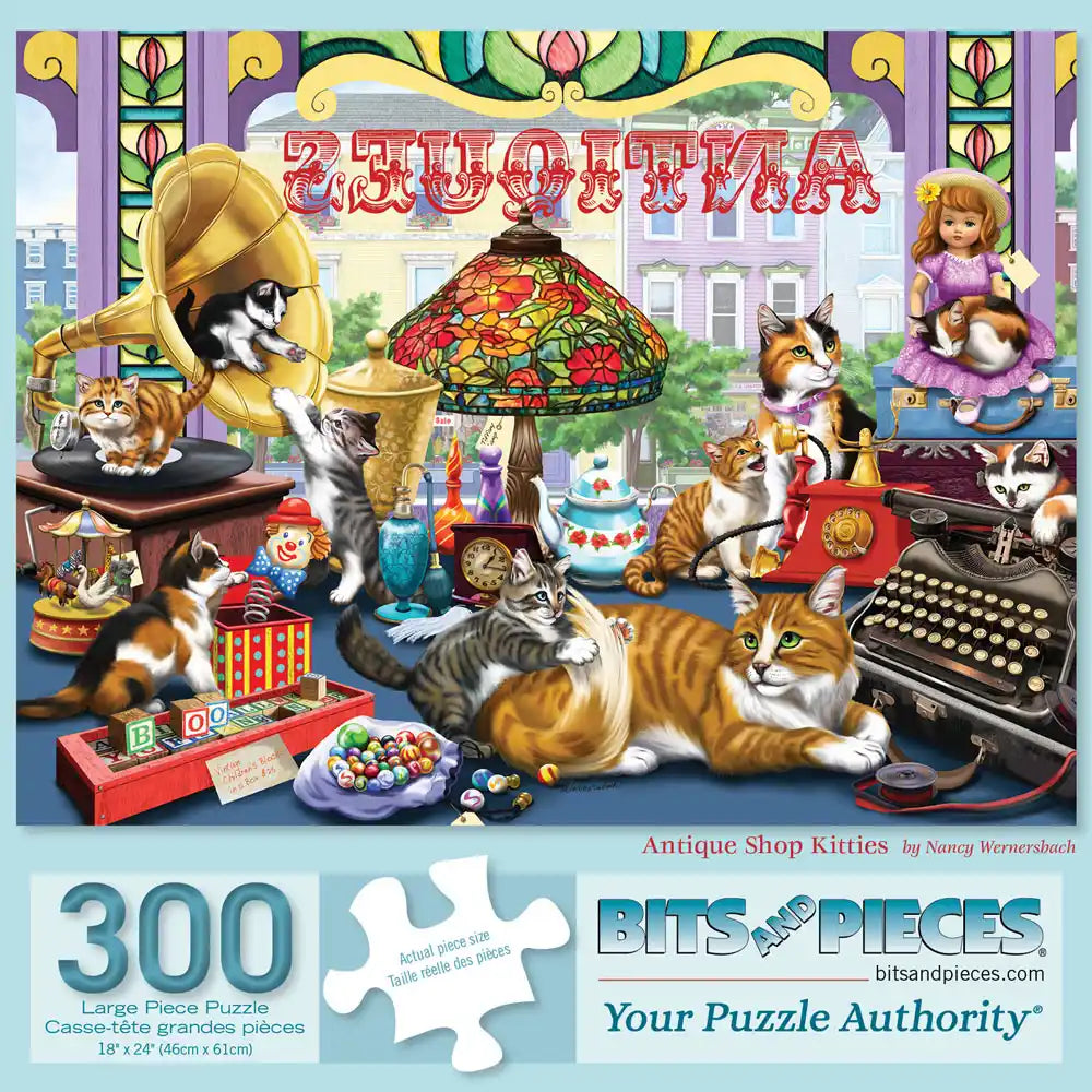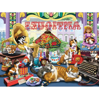 Step into a cozy vintage treasure trove with Antique Shop Kitties! Nancy Wernersbach’s playful cats bring life to a shop filled with timeless trinkets, a Tiffany lamp, and a touch of feline mischief. Perfect for cat lovers and antique fans alike, this colorful puzzle guarantees hours of heartwarming fun.