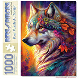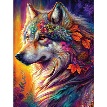 Unveil the mystical beauty of the wilderness that brings the majesty of the natural world into your home. This artwork by RomantzArt features a wolf adorned with a crown of autumn leaves and florals. The hues dance across the canvas like the aurora borealis, with each piece of the puzzle a melody in the visual opus of colors. It's a soul-stirring challenge that beckons to be pieced together, igniting the spirit of adventure with every connection. Available in multiple piece puzzle. Puzzles are renowned for their engaging complexity, offering a satisfying challenge with their smaller, intricate pieces.