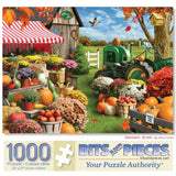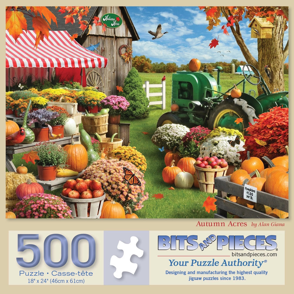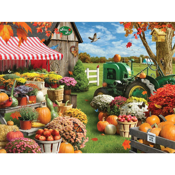 Pull the tractor around to this lovely farmstand. Autumn Acres shows off a wonderfully peaceful scene of fall-time bounty, in which cardinals, woodpeckers, and butterflies visit a full-to-bursting produce stand. Has the farmer just stepped off-scene to load up another wheelbarrow of pumpkins? Get lost in the small-town Americana charm of this gorgeous farm bringing in the bounty of a hard season's work. Whether you're completing this puzzle by yourself or with a friend, you'll enjoy that warm and cozy, hot-apple-cider feeling with this lovely illustration.