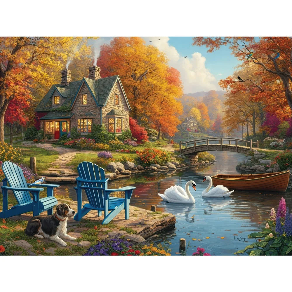 Iris Sage’s Autumn By The Cozy Cottage shows a peaceful riverside home surrounded by fiery fall foliage. Swans glide past as Adirondack chairs invite you to sit and enjoy the crisp air. A perfect autumn jigsaw puzzle for fans of serene and colorful country scenes.