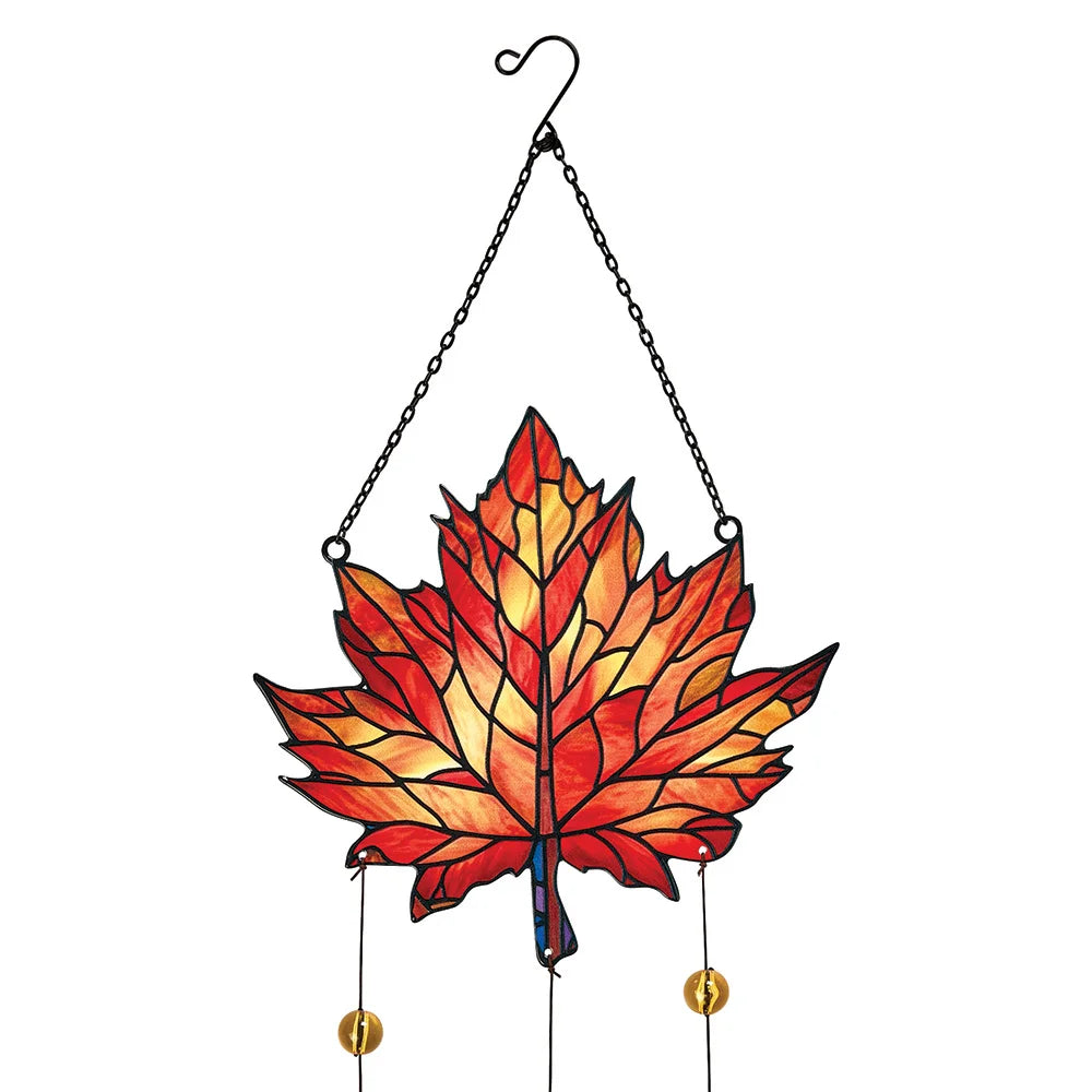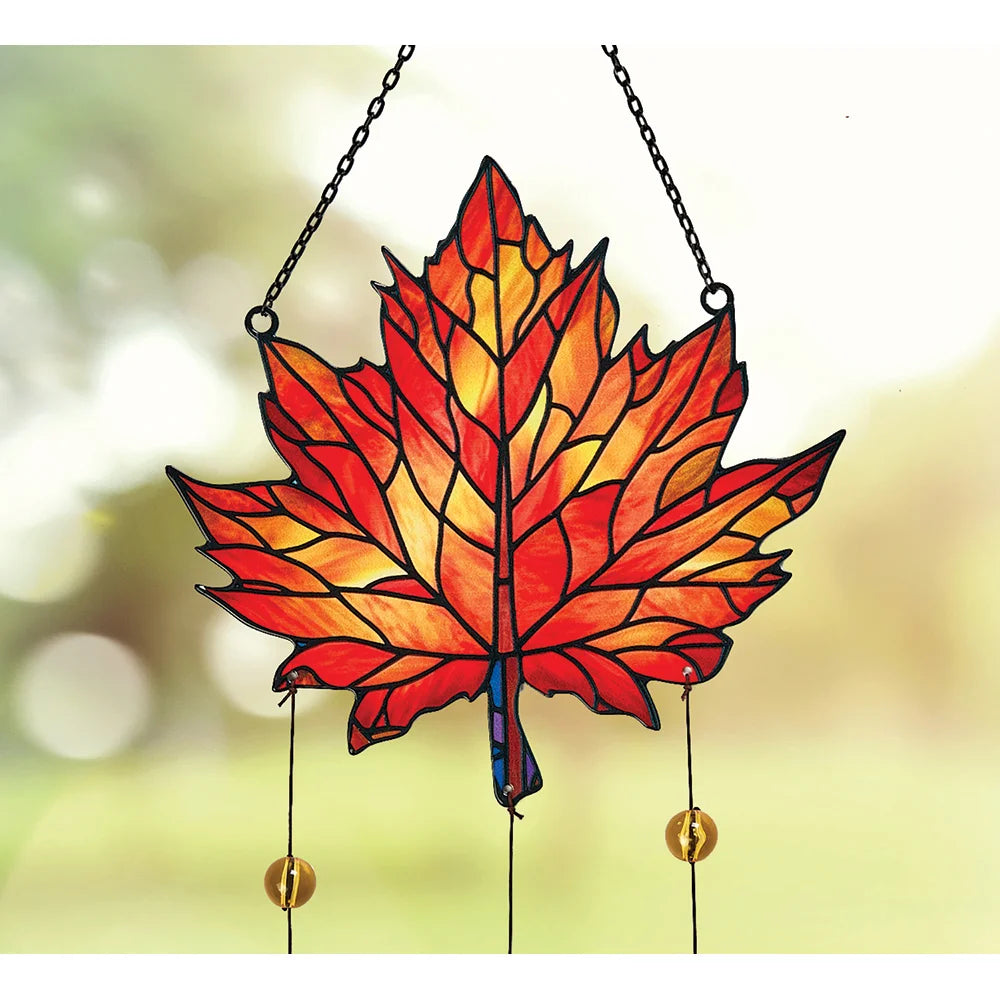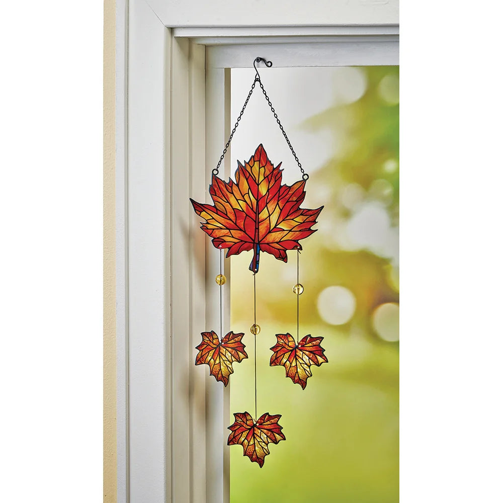 Bring a touch of fall to your porch or window with this stained-glass style mobile. Crafted from solid iron with a double-sided stained-glass look, each leaf shimmers with glowing reds, oranges, and golds—just like the real thing. Measuring 24" long x 7-3/4" wide, it catches sunlight beautifully and sways gently in the breeze. A stunning tribute to autumn’s magic, indoors or out.