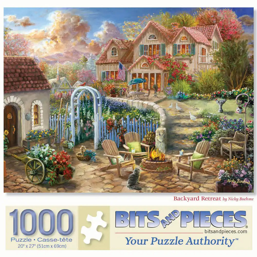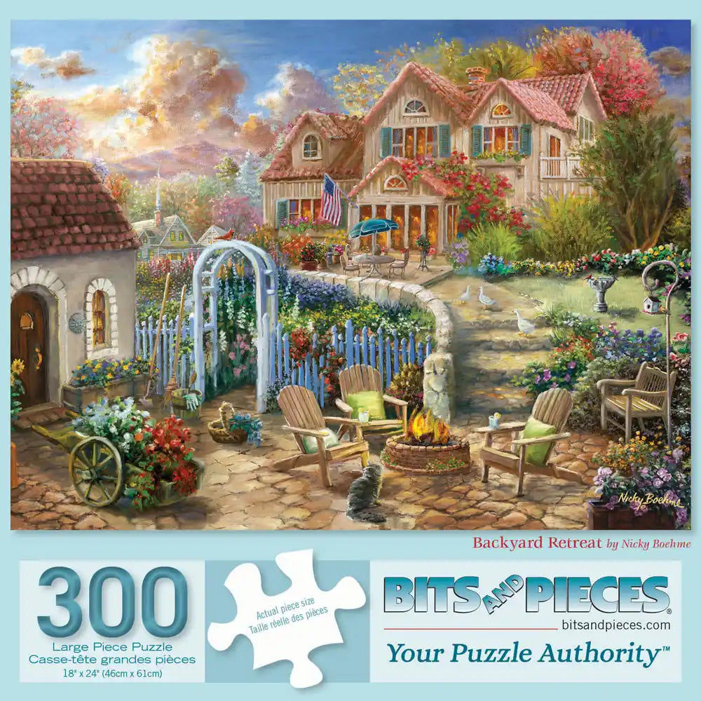 Step into a serene paradise with the Backyard Retreat puzzle, masterfully illustrated by Nikki Boehme. This jigsaw puzzle showcases a stunning backyard sanctuary complete with blooming gardens, cozy Adirondack chairs surrounding a glowing fire pit, and charming pathways that invite exploration. Nestled among vibrant flowers and tranquil wildlife, the picturesque cottage exudes warmth and relaxation. Ideal for puzzle lovers, this delightful scene captures the essence of peaceful country living.