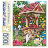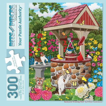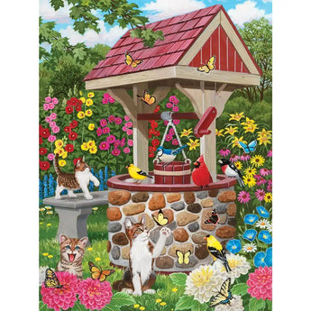 Immerse yourself in the heart of a serene backyard paradise with this enchanting jigsaw puzzle. The scene is a whimsical creation by the talented William Vanderdasson. A quaint wishing well stands as the centerpiece, surrounded by colorful blooms and visited by the vibrant local birds. Watch as butterflies dance and kittens playfully peek through the flowers, bringing this idyllic garden scene to life. A perfect blend of challenge and tranquility, it's an ideal escape into a world where every wish for peace and beauty is granted. Also available in a 300-piece puzzle. Puzzles are renowned for their engaging complexity, offering a satisfying challenge with their smaller, intricate pieces.