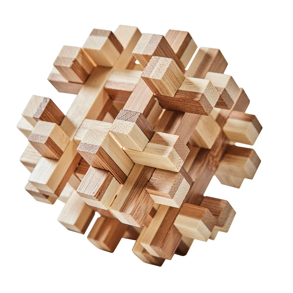 Challenge yourself with this intricate and eye-catching bamboo puzzle. Crafted from 24 interlocking, multi-tone bamboo sticks, it’s as beautiful as it is brain-bending. Whether you're killing time at your desk or gifting it to a puzzle lover, this tactile twister is sure to captivate. Measures 2-3/4" x 2-3/4". Solution included. Recommended for ages 14 and up. Made from natural bamboo.