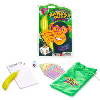 A great game for monkeying around. Banana Blitz is simple and great to play with kids! The player with the pen writes a sequence as fast as they can. The player to their left rolls the die again and again until they roll a banana. When a banana is rolled, other players can snatch the pen and start the sequence over while the next player then begins rolling. The first player to complete the sequence wins. It's all out Banana Blitz, Banana Graba action! The game includes: 1 banana pen, 1 monkey dice, 6 challenge cards (Level 1-6), pad of paper rule sheet and a game bag to store all the items. For 2 or more players. Ages 5 and up.
