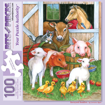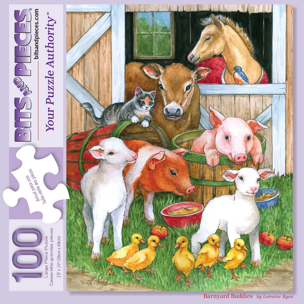 Larger than usual puzzle pieces may be easy to handle, but don't be fooled. This beautiful puzzle is still exciting and a challenge to put together. Ages 6+. This large piece jigsaw puzzle is designed by Lorraine Ryan and available in multiple piece counts. A friendly group of barn animals spend some quality time together!