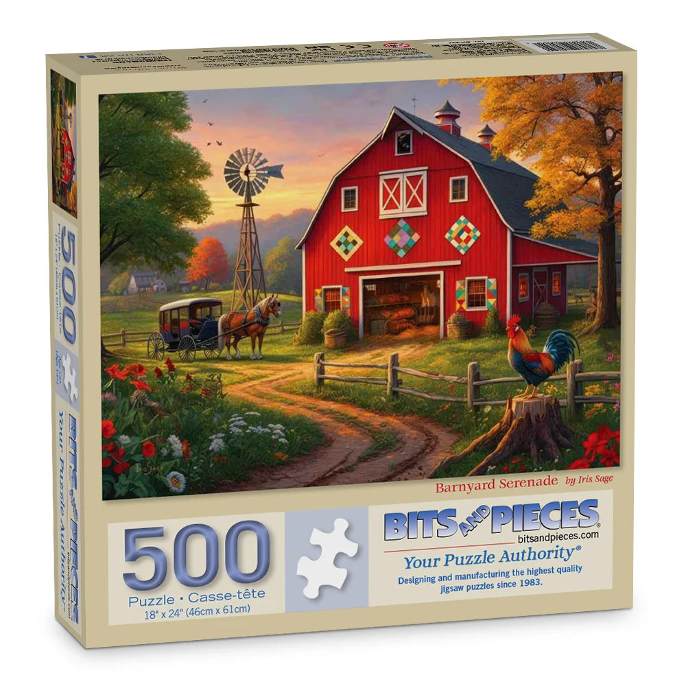 In Barnyard Serenade, Iris Sage captures a red barn bathed in golden light, with horses grazing and flowers in full bloom. A windmill spins gently in the background, making this jigsaw puzzle an ideal choice for farm lovers and rustic country décor fans.