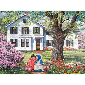 This jigsaw puzzle is designed by John Sloane. The two best friends giggle and chat together after spending time picking flowers. Available in multiple piece counts.