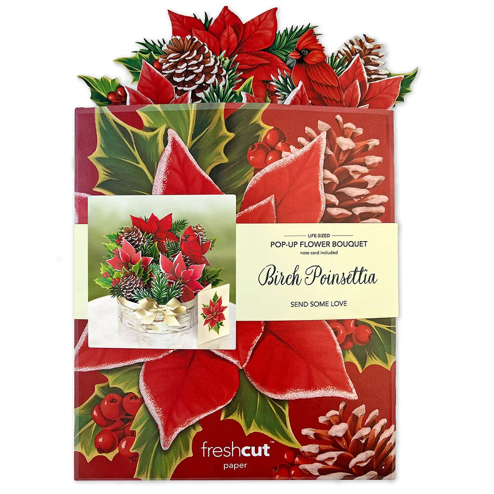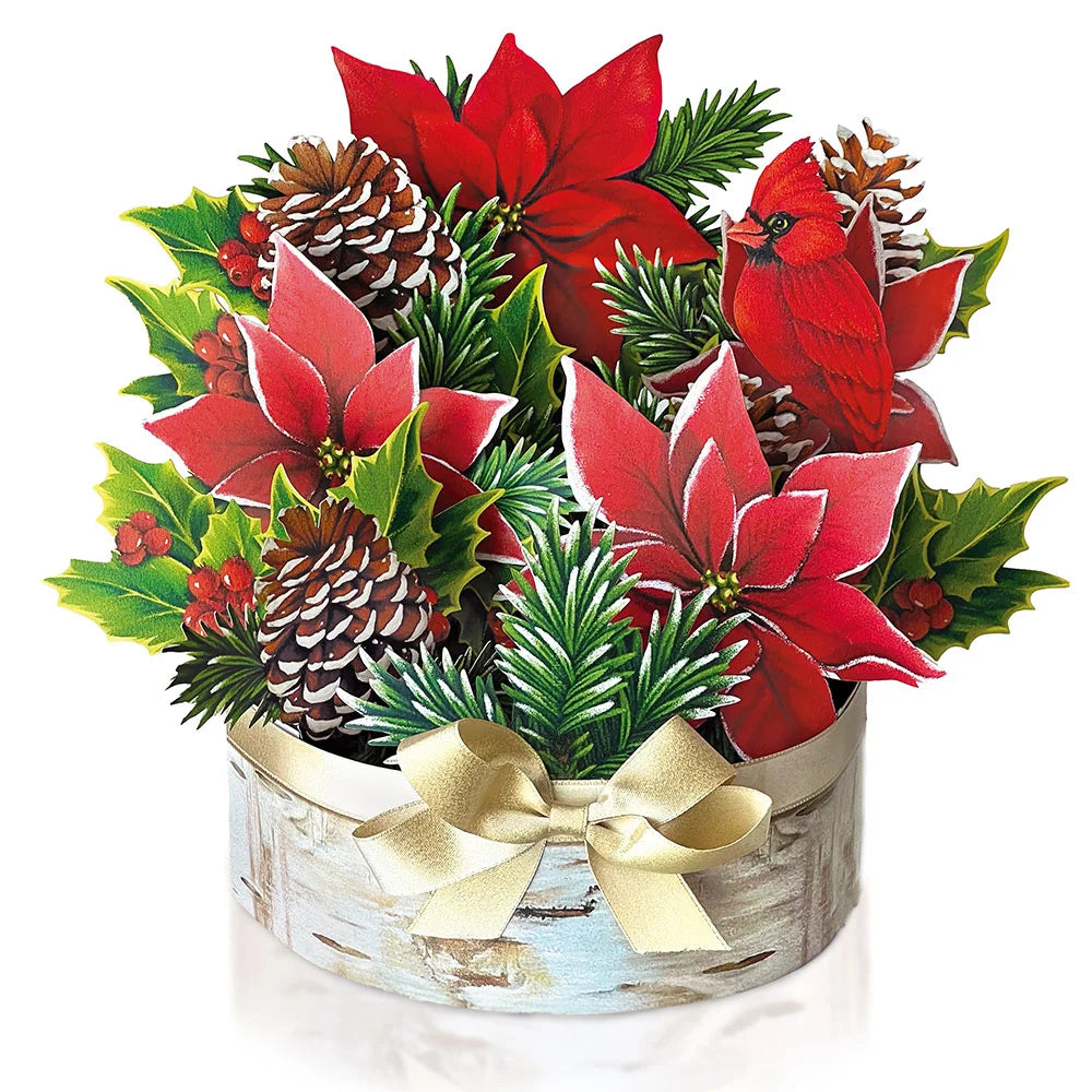 Send the warmth of the season in full bloom with this stunning pop-up Birch Poinsettia Card. Bursting with festive detail, it opens to reveal a charming birch basket brimming with vibrant paper poinsettias, pinecones, evergreens, and a bright red cardinal. A joyful keepsake that lasts well beyond the holidays, it’s perfect for mantle displays or tabletop cheer. Includes a coordinating notecard for your personal message and an envelope for mailing. Extra postage required. Folds flat for easy sending. 12"H when open.