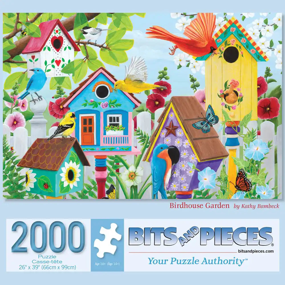 This jigsaw puzzle is designed by Kathy Bambeck and available in multiple piece count. The birds soar into and perch on their colorful birdhouses standing tall in front of the white picket fence.