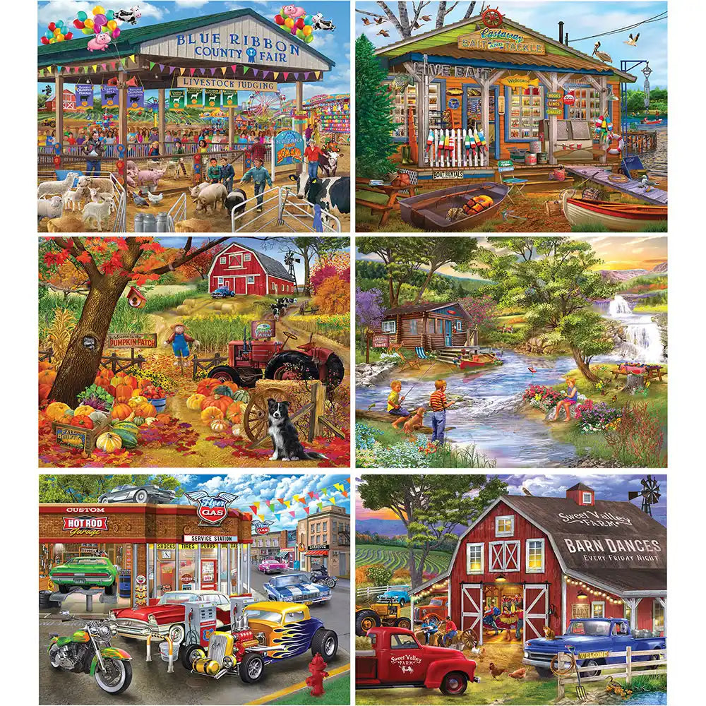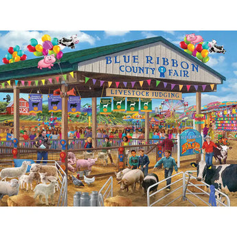 Experience the excitement of the Blue Ribbon County Fair! Bigelow Illustrations brings this bustling fairground to life with lively livestock judging, colorful balloons, and the thrill of carnival rides in the background. From prize-winning animals to cheerful fairgoers, every piece captures the charm of a classic county fair. Perfect for puzzlers of all ages, this vibrant scene will leave you smiling from start to finish.