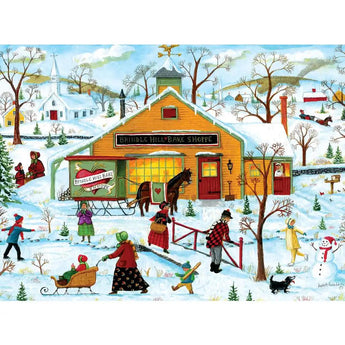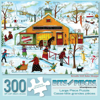 This 300 large piece jigsaw puzzle is designed by Joseph Holodook and measures 18" x 24". This puzzle depicts the citizens of this snow-covered town enjoying the day in front of a warm bakery. Available in two piece counts.