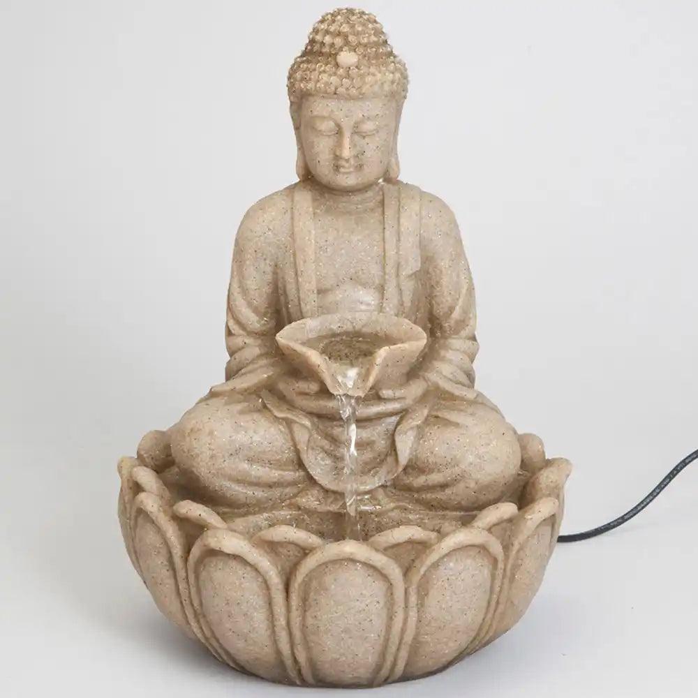 Add this restful, meditating Buddha tabletop fountain to an outdoor or indoor area of your home for a beautiful, serene accent. Experience the soothing sound of water while bringing harmony to your environment. Sculpted of polyresin to resemble old world carved stone. Measures 11" high x 7-1/2" wide x 5-1/2" deep. Whisper quiet concealed pump, power cord, and instructions included. For indoor and covered outdoor use.