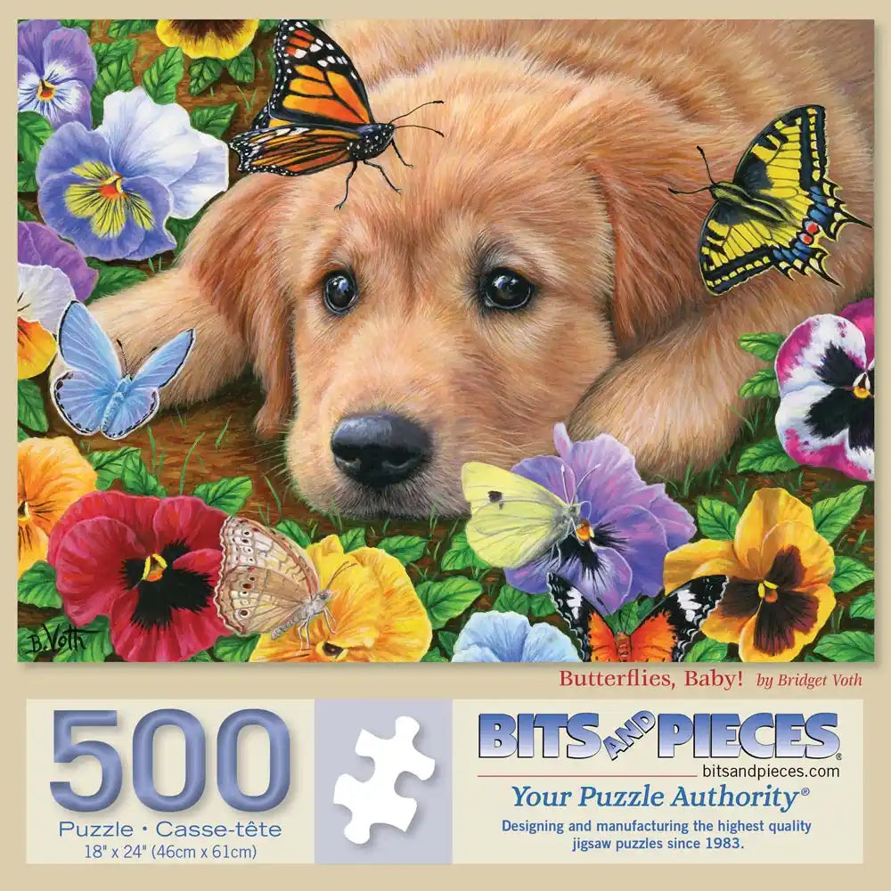 Get ready for cuteness overload with Butterflies, Baby! by Bridget Voth. This sweet puzzle showcases an adorable puppy surrounded by colorful flowers and fluttering butterflies. Perfect for animal lovers, this puzzle brings together the beauty of nature and the charm of a playful pup.