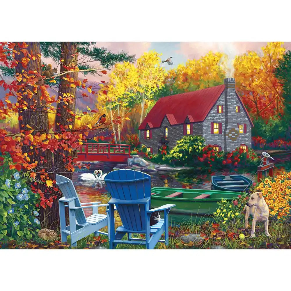 This jigsaw is designed by Chantal Candon and available in multiple piece count. The leaves start to turn orange, red, and yellow around the cabin on the lake for the fall time.