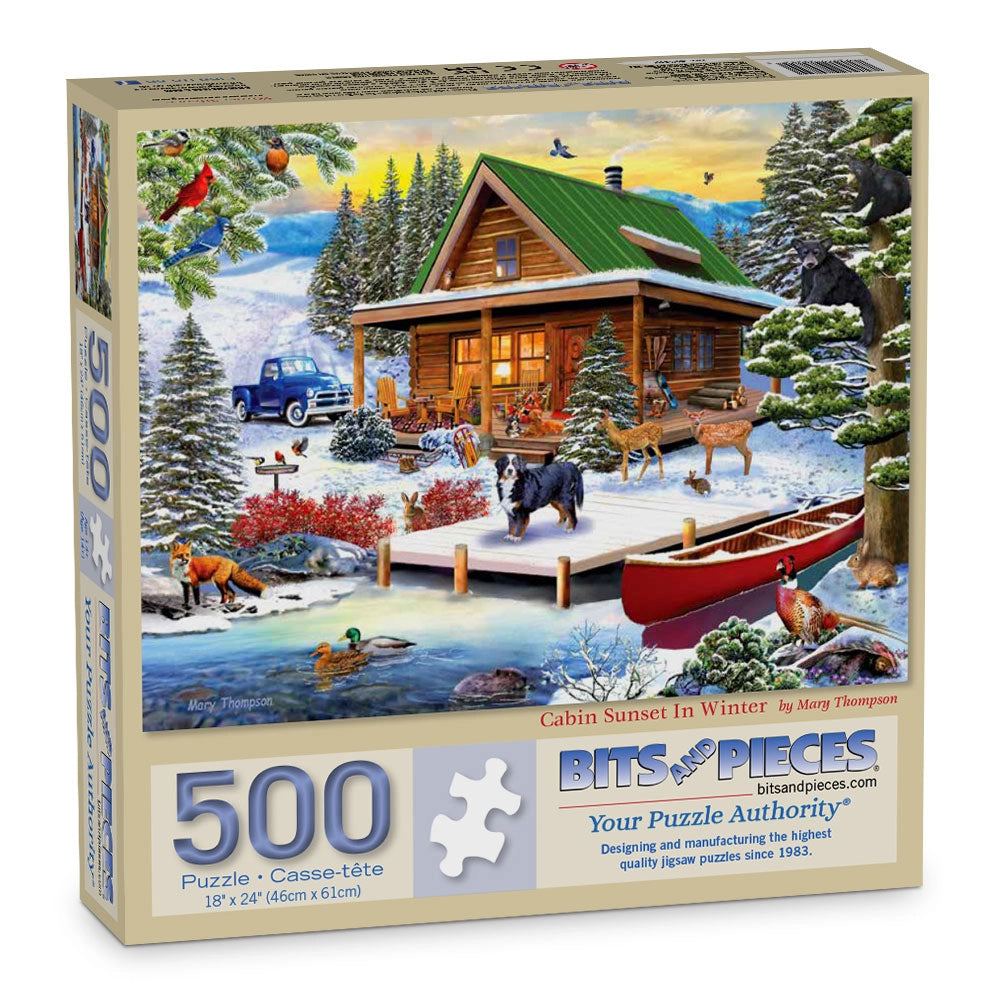 The Cabin Sunset in Winter puzzle by Mary Thompson invites you into a snow-covered lakeside retreat where golden light spills from the windows and dogs dash through the frost. A red canoe rests by the frozen dock, birds perch on snowy pine boughs, and every detail feels like a quiet winter story. This puzzle is pure cozy cabin charm, piece by piece.