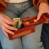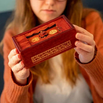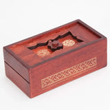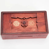 No one will be able to get to your savings using this clever box. Slide your coins and bills through the money slot then look for the challenging solution to open it. Made of pinewood with a rich walnut stain. 5-7/8" x 2-1/8" x 3-1/8". Solution included.
