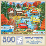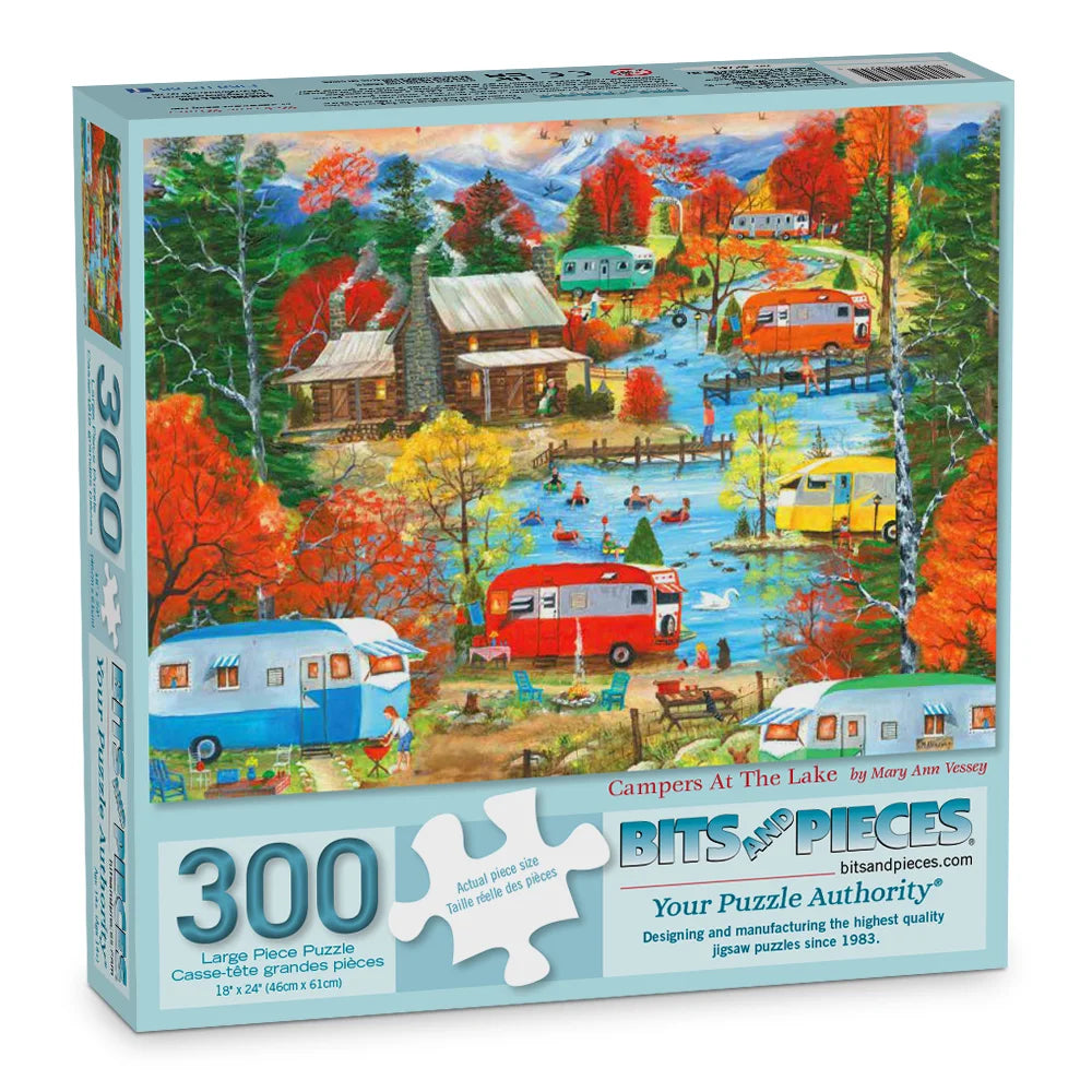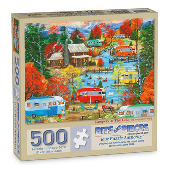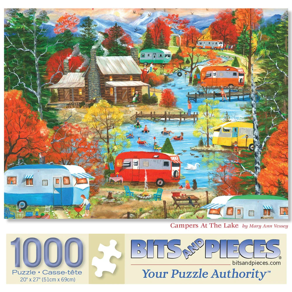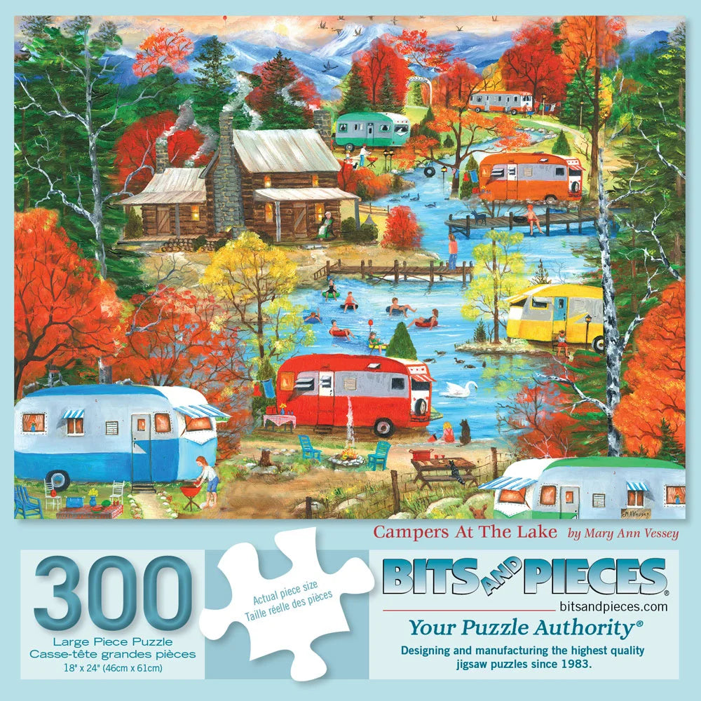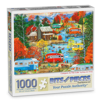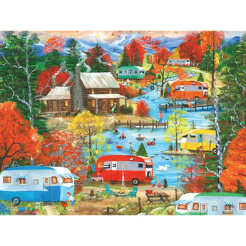 Campfires, canoes, and cozy cabins—Campers at the Lake by Mary Ann Vessey is a joyful celebration of the great outdoors. Bright vintage trailers line the lakefront as families swim, fish, and paddle through a colorful autumn wonderland. With vibrant foliage, mountain views, and plenty of lakeside charm, this puzzle captures the fun and freedom of a perfect weekend getaway.