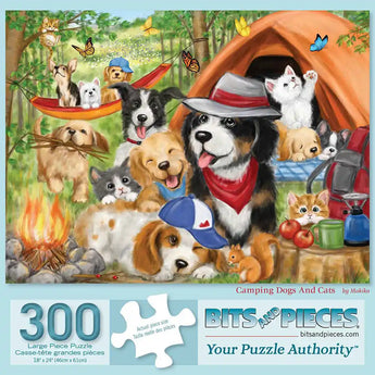 Embark on an adorable camping adventure with "Camping Dogs and Cats," a delightful jigsaw puzzle designed by the talented Makiko. This vibrant and heartwarming scene captures a group of playful pups and curious kittens enjoying the great outdoors. From a cozy tent filled with napping animals to a crackling campfire surrounded by wagging tails, every piece of this puzzle tells a story of camaraderie and fun. Butterflies flit through the air, adding a whimsical touch, while a hammock holds the tiniest campers soaking up the sun. Available in multiple piece counts.