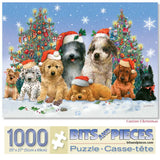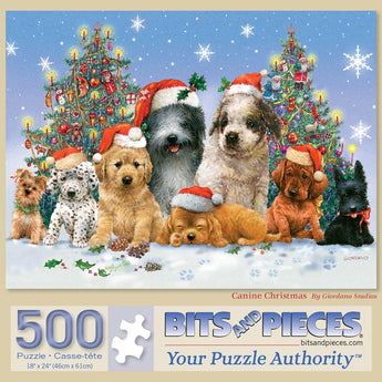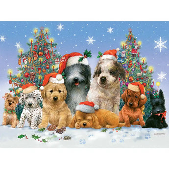 Canine Christmas is a jigsaw is designed by Bob Giordano. A group of dogs sit together between two Christmas trees on a snowy, star-filled night. Available in multiple piece counts.