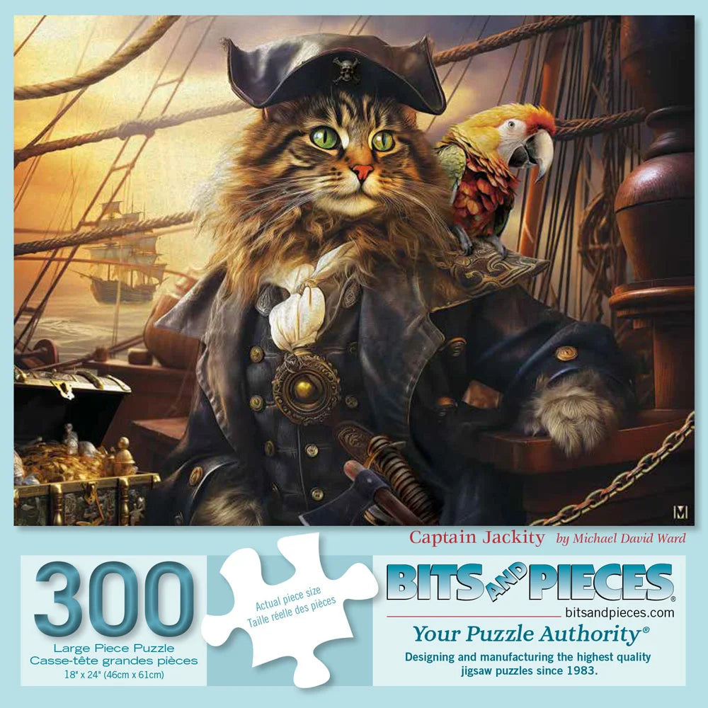 Set sail on a high-seas adventure with Captain Jackity by Michael David Ward. This fearless feline captain, complete with pirate hat and trusty parrot, is ready to shout "Arrggg!" as they navigate the open waters. The richly detailed ship and dramatic sunset make this a fun and captivating challenge for puzzle lovers of all ages.