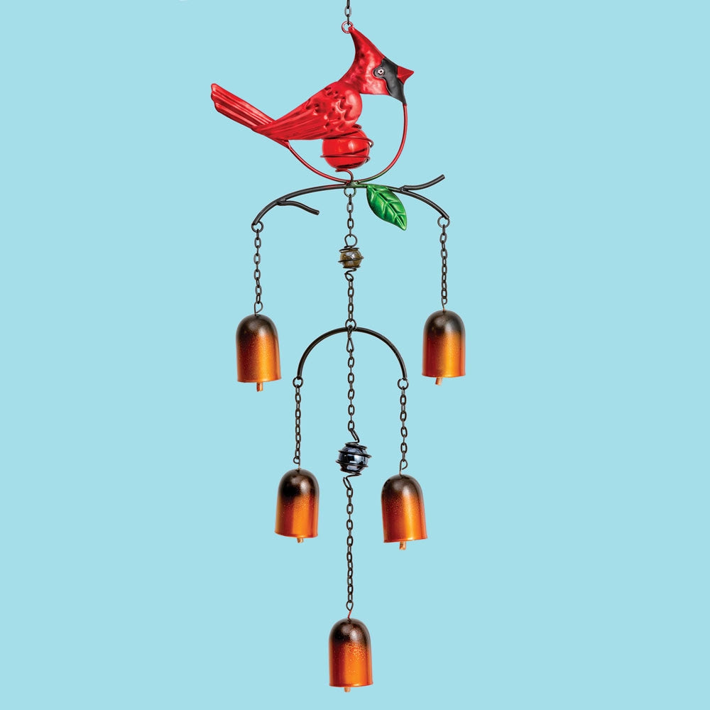 Our charming cardinal wind chime will greet you on a breezy day with the gentle sound of bells chiming. This happy bird and his shapely bells are constructed of painted iron with glass ball accents. A lovely addition to your garden décor, and a great gift for any bird lover! Includes hook for hanging and measures 19" long x 5-3/4" wide.