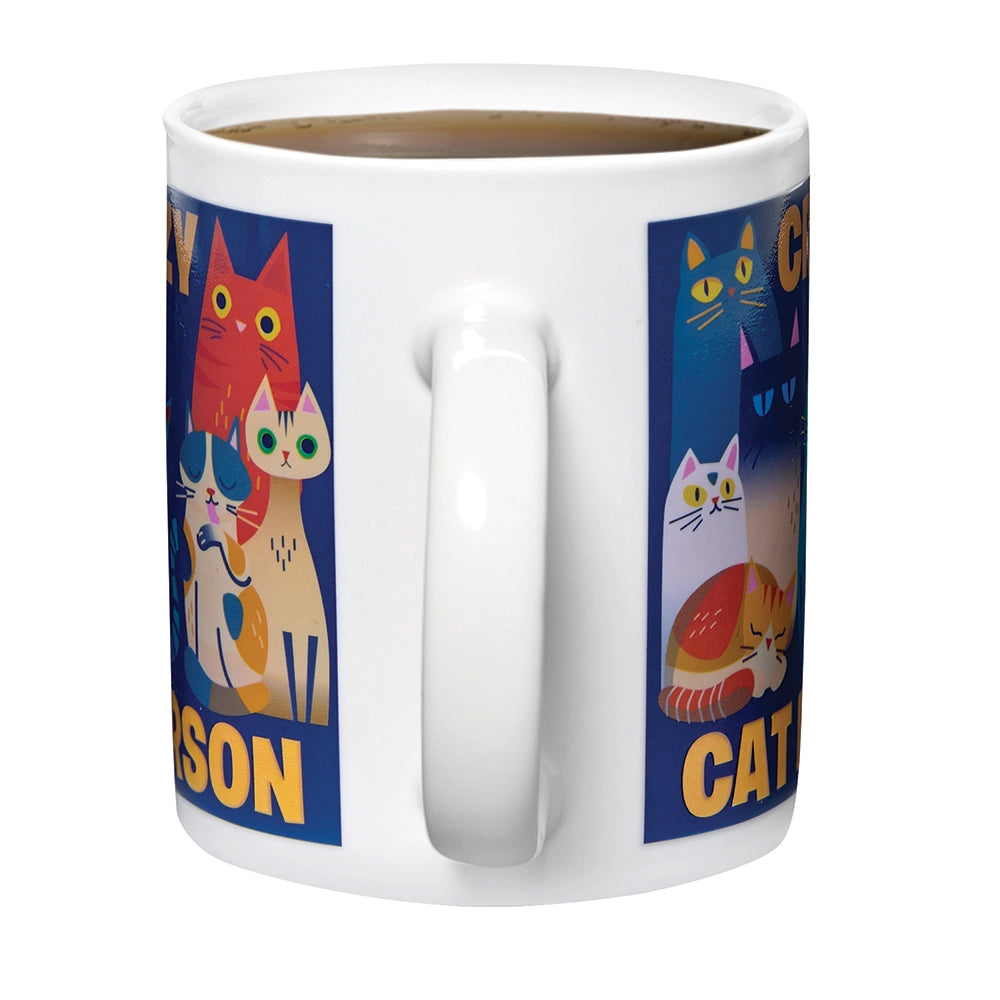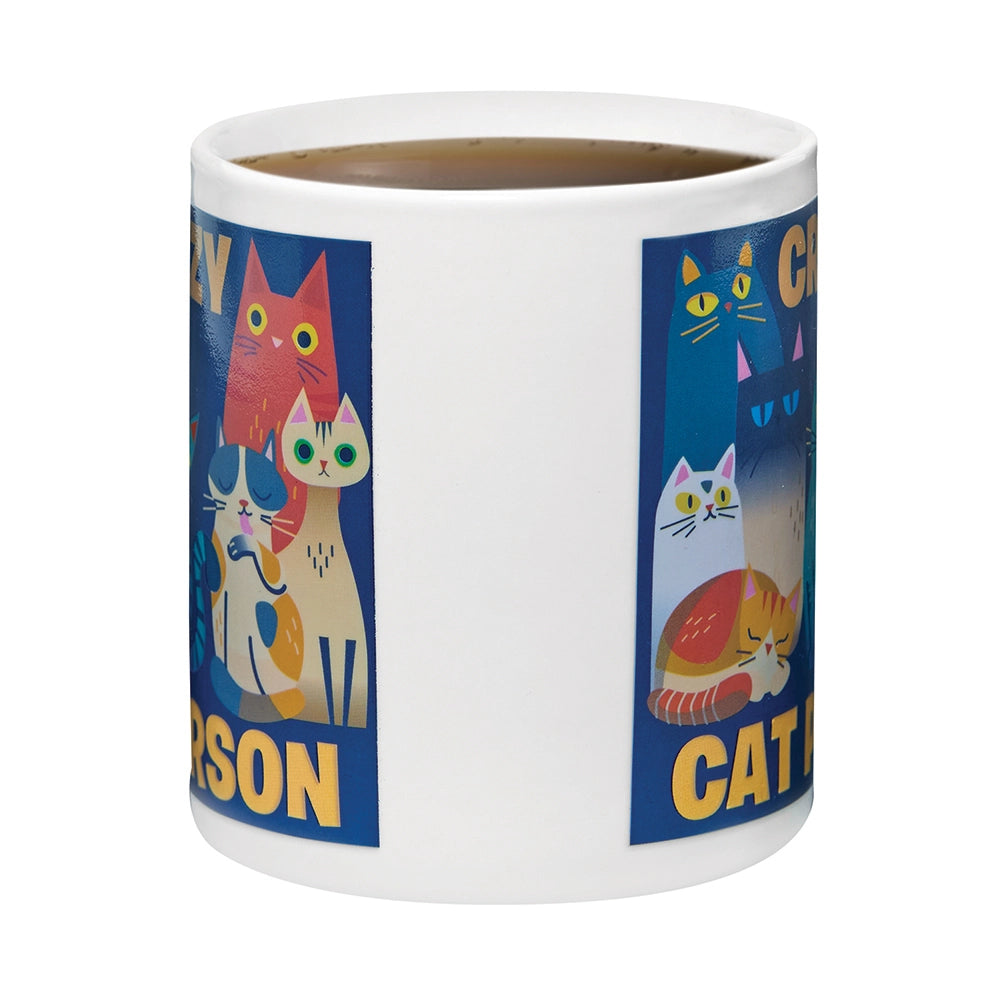 Show off your feline devotion-one sip at a time! Our playful Crazy Cat Person Mug features a charming cat illustration with the simple declaration “Cat Person”. But pour in your favorite hot beverage and watch the magic happen: the design transforms as more adorable cats appear, along with the word “Crazy” above them. Suddenly, your mug proudly reads “Crazy Cat Person” because let’s be honest, you’re in good company. Holds 11 oz. Hand wash.