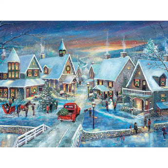 Immerse yourself in the charm of a snowy holiday evening with "Christmas Village" by Ruane Manning. This picturesque artwork brings a vibrant winter village to life, complete with warmly lit homes, a horse-drawn sleigh, and cheerful villagers decorating for the season. The peaceful glow of holiday lights and the serene snow-covered streets make this puzzle a heartwarming seasonal treasure. Perfect for holiday enthusiasts and puzzle lovers, it captures the magic of a festive winter night.