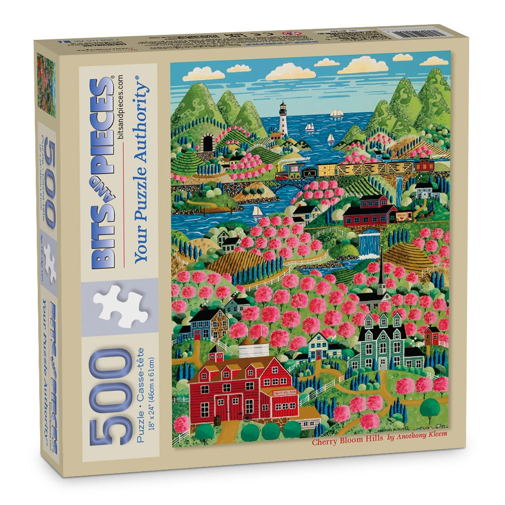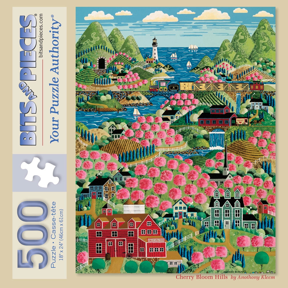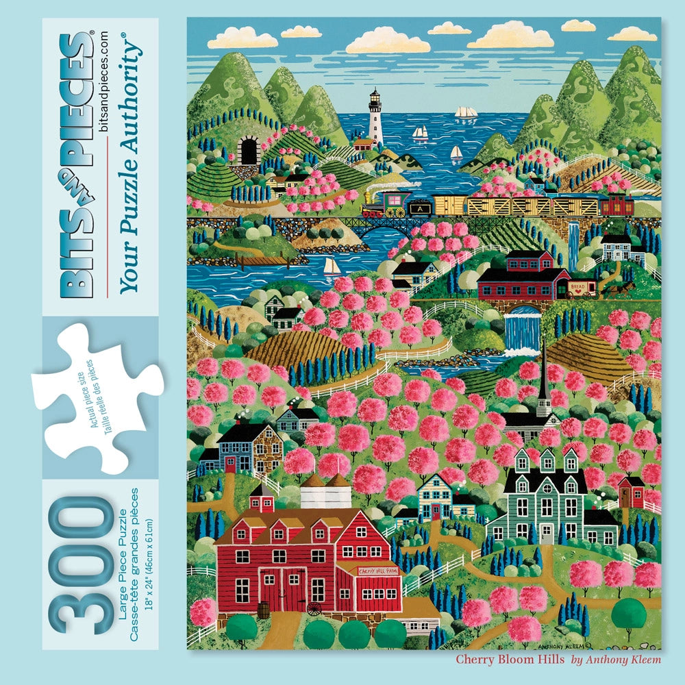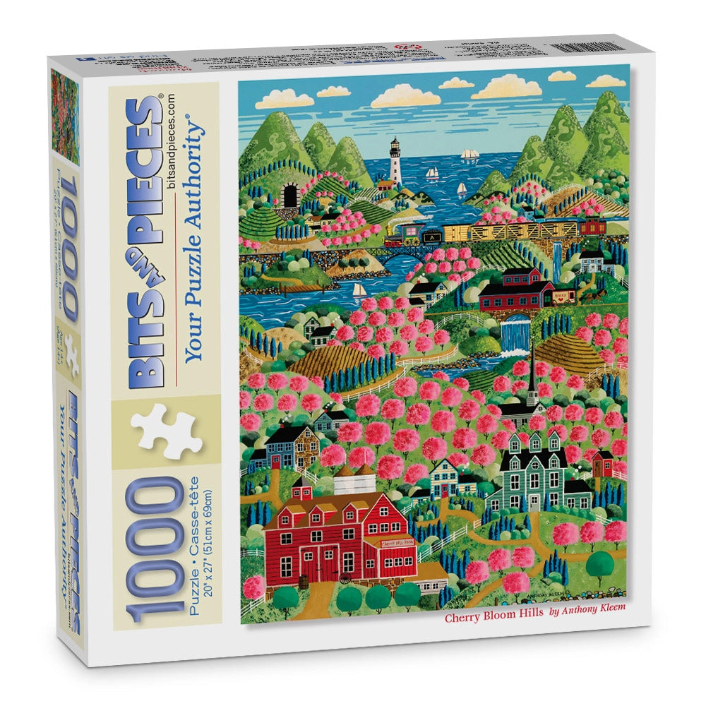 In Cherry Bloom Hills by Anthony Kleem, colorful homes line winding roads as cherry blossoms blanket the countryside. With its detailed rooftops, trees in full bloom, and peaceful rolling hills, this jigsaw puzzle paints a cheerful small-town springtime scene.