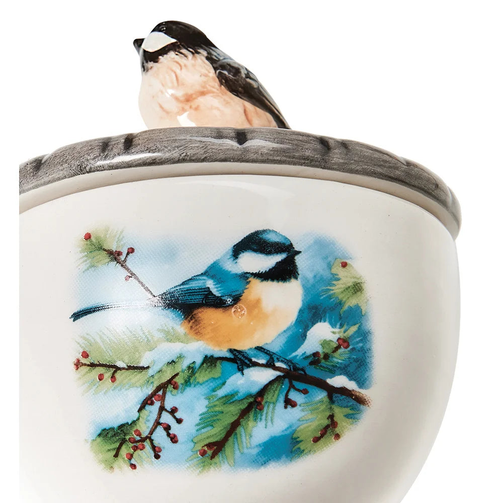 This exquisite ceramic box showcases a dimensional chickadee perched gracefully atop its lid, serving as a charming handle. Delicate tree branches, accented with red berries and a tiny chickadee, adorns the side, adding a touch of nature-inspired beauty. Perfect for storing jewelry, candies, or small treasures, it measures 4-1/8" in diameter and 4-1/4" high—an elegant and thoughtful gift for friends and loved ones.