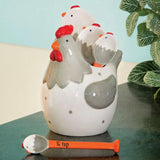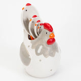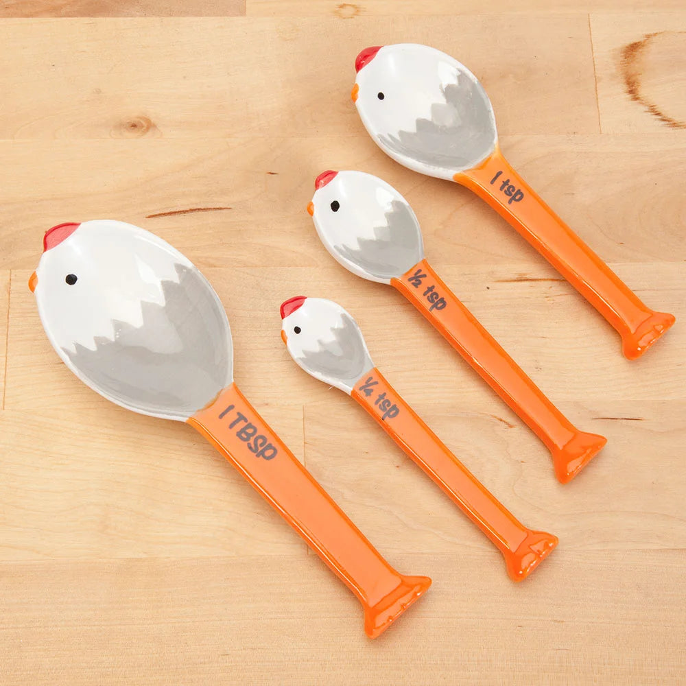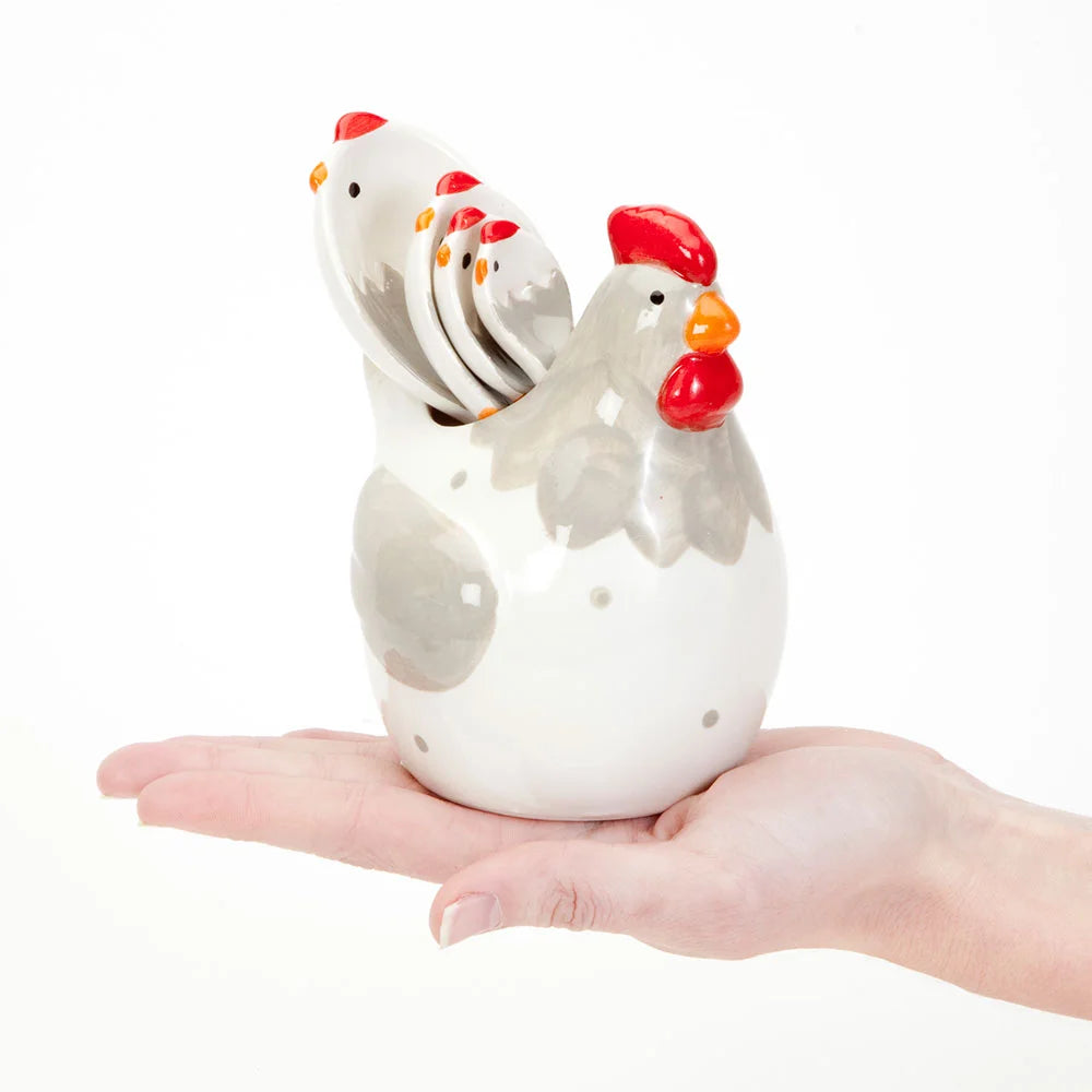 Whimsical, and practical too! Our ceramic chicken figure keeps four measuring spoons always at the ready while adding quirky charm to your kitchen. Each ceramic chicken spoon has the measurement printed on the handle. Chicken holder measures 5" x 4" x 3-1/2".