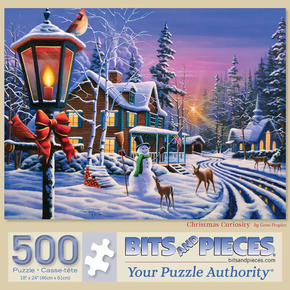 This jigsaw puzzle is designed by Geno Peoples and available in multiple piece count. Puzzles are perfect for both intermediate puzzle enthusiasts and group activities. A log cabin stands as the backdrop to a snowman, drawing deer closer with their curiosity. Additionally, two cardinals rest on a lamp post in this tranquil snowy setting, creating a scene filled with wonder and charm. Available in two-piece count.