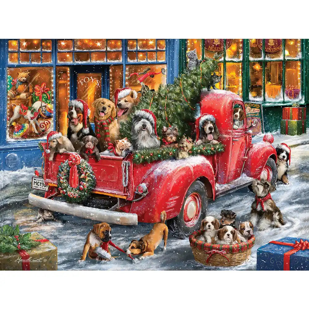This jigsaw puzzle is designed by ALI Corti and available in multiple piece count. Puzzles are renowned for their engaging complexity, offering a satisfying challenge with their smaller, intricate pieces. In this captivating glow-in-the-dark puzzle, a red truck is parked with a Christmas tree in the back, while a lively group of dogs gathers around, donning festive hats and scarves. Illuminated shops in the background add to the holiday cheer, making this scene a whimsical and festive holiday delight. Available in multiple piece counts.