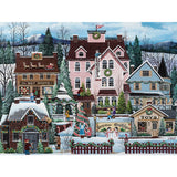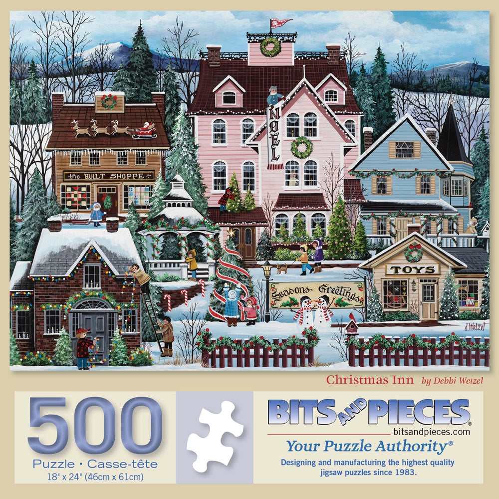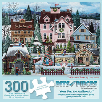 Immerse yourself in the cozy charm of the holiday season with our Christmas Inn puzzle, featuring artwork by the talented Debbi Wetzel. This delightful scene transports you to a quaint, snow-covered village where a cluster of inviting shops, including a toy shop, are decked out in festive decorations. A beautifully adorned Christmas tree stands proudly in the center, while a warm "Noel" sign adds to the festive cheer. The intricate details and vibrant colors of this picturesque village scene are sure to bring the joy of Christmas to your puzzling experience. Available in both 300 and 500 piece counts, this puzzle is perfect for any level of puzzler looking to add some holiday magic to their collection.